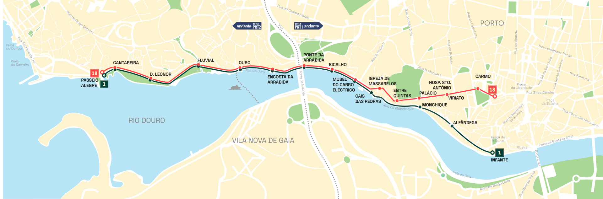 It runs between Porto's historic center and Jardim do Passeio Alegre on a single route along the banks of the Douro River.