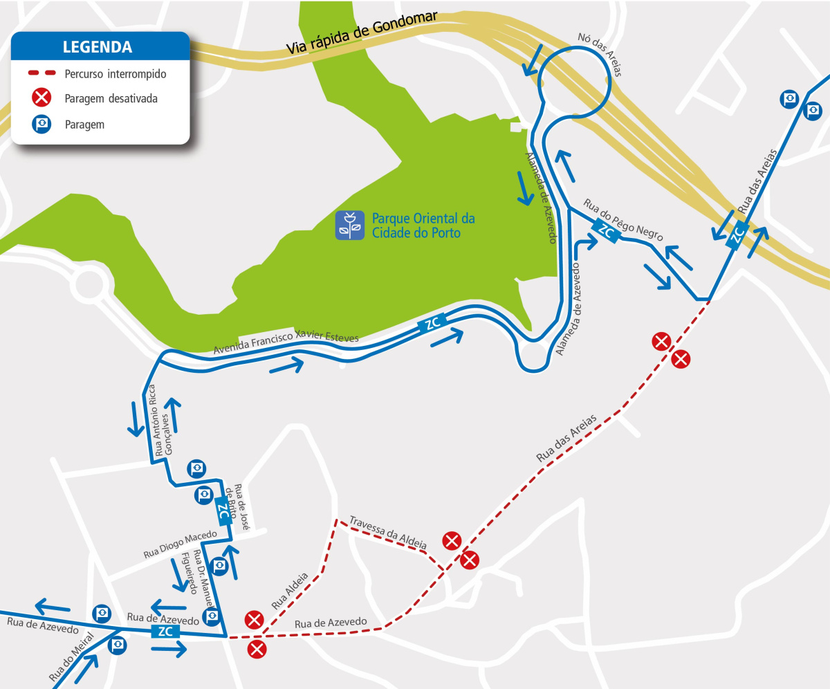 R. de Azevedo, R. Dr. Manuel Figueiredo, R. Diogo Macedo, R. José de Brito, R. António Ricca Gonçalves, Av. Francisco Xavier Esteves, Alameda de Azevedo, R. do Pêgo Negro, R. das Areias and normal route.