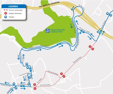 Between April 7th and 10th, and on April 13th, between 9:00 AM and 6:00 PM, due to roadworks on Rua das Areias (Porto), the vehicles on this line will have the following route change: