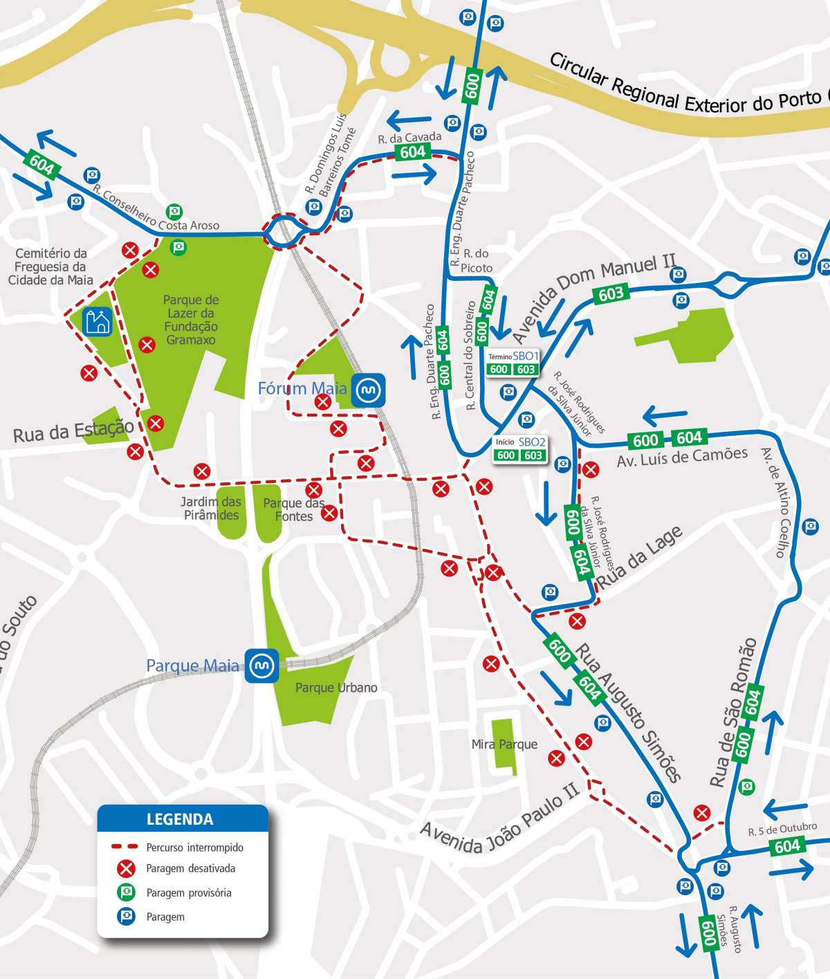 R. Conselheiro Costa Aroso, R. Domingos Luís Barreiros Tomé, R. da Cavada, R. Eng. Duarte Pacheco, R. do Picoto, R. Central do Sobreiro, Av. Dom Manuel II, R. José Rodrigues da Silva Júnior and normal route.