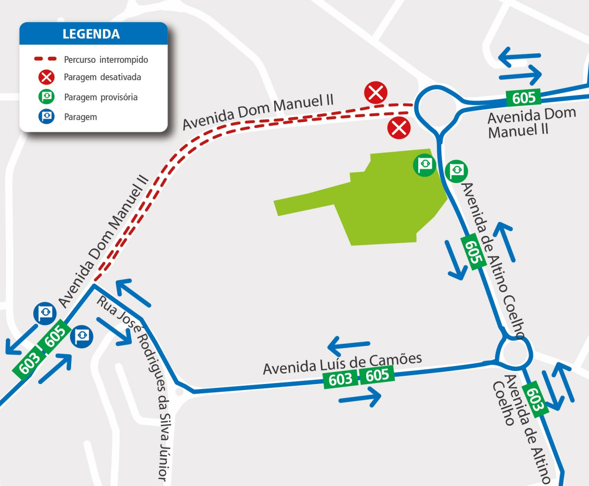 Av. Dom Manuel II, R. José Rodrigues da Silva Júnior, Av. Luís de Camões, Av. de Altino Coelho and normal route.