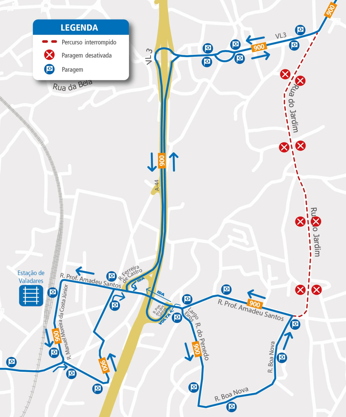 R. do Jardim, VL3, na rotunda entrada para a A44 (direção Valadares), R. Ferreira de Castro, R. Professor Amadeu Santos, Largo Eirós, R. do Penedo, R. Boa Nova, R. Prof. Amadeu Santos e percurso normal.
