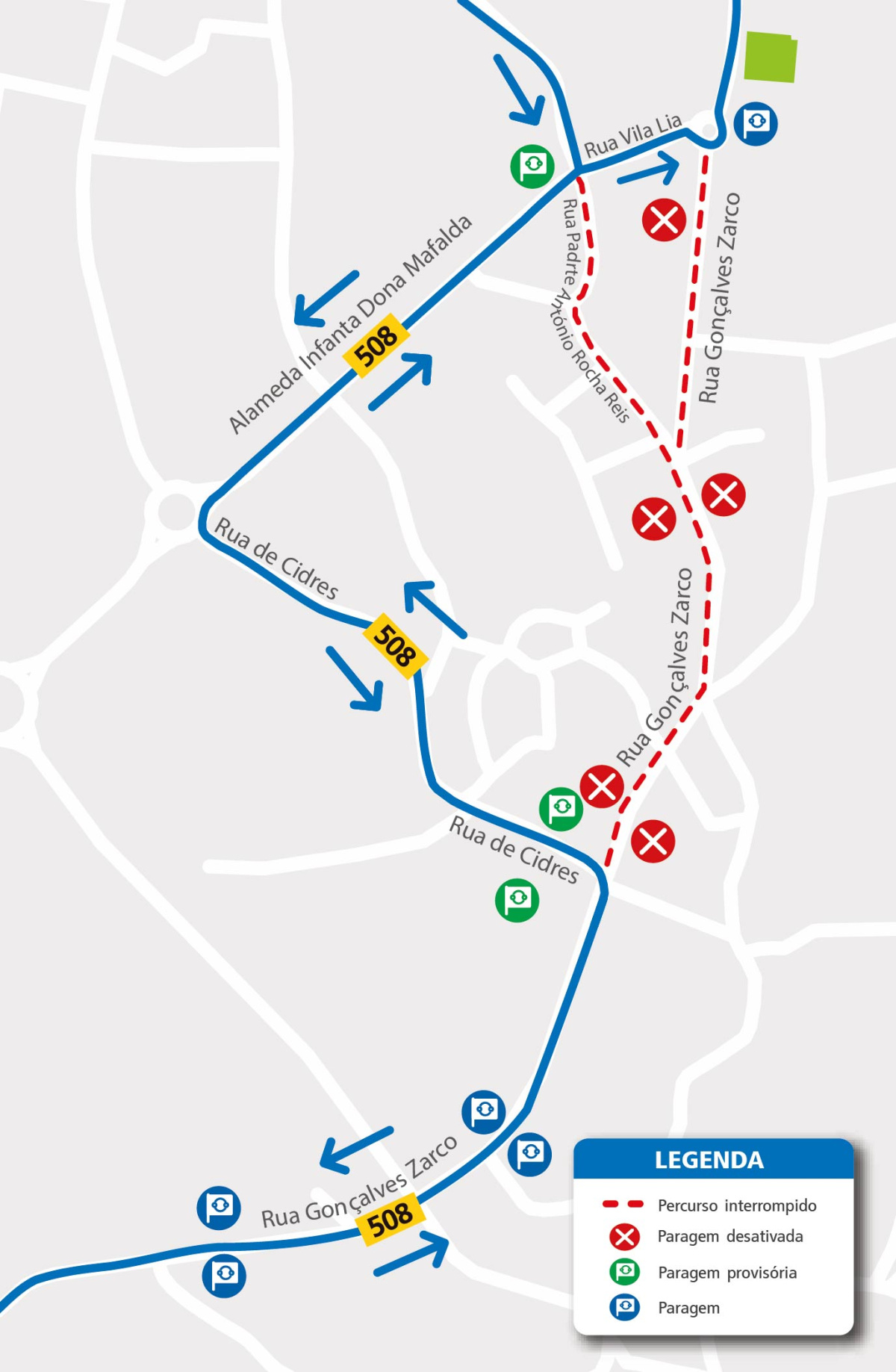 R. Gonçalves Zarco, R. de Cidres, Alameda Infanta Dona Mafalda, R. Vila Lia e percurso normal.